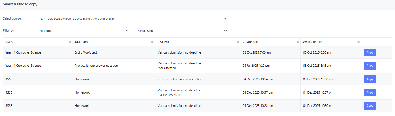 If you need to copy an existing task - to allocate it to another class, for example - go to: