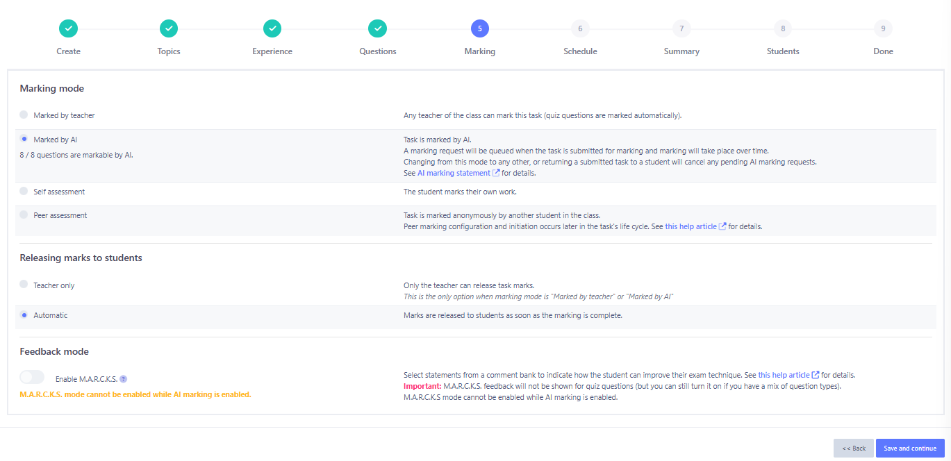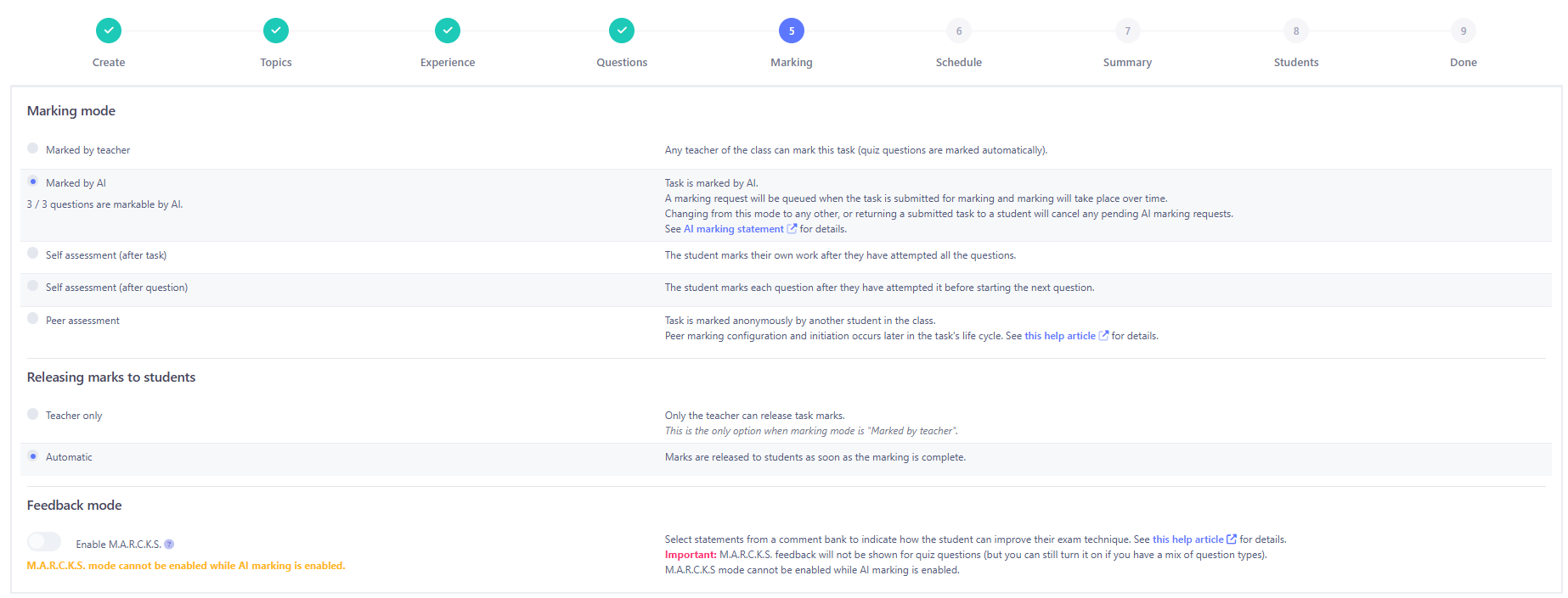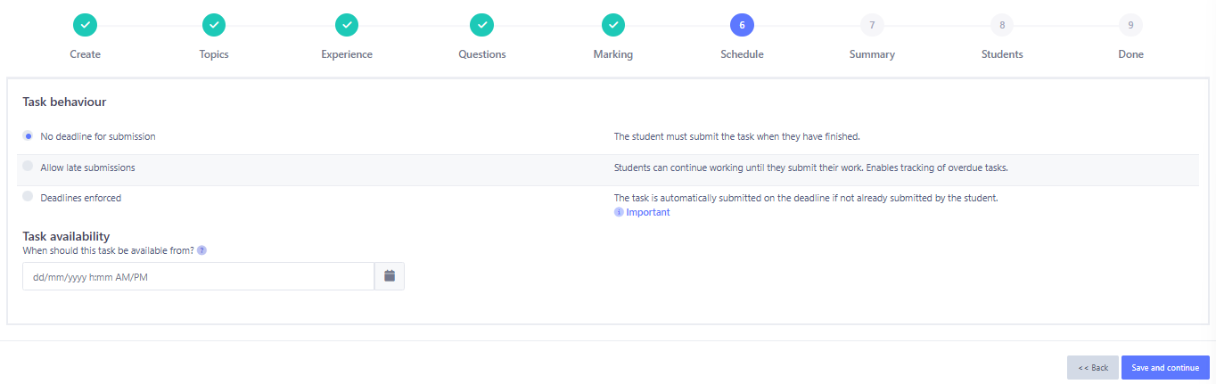 Here you can set if your tasks have no deadline, no late submissions or deadlines enforced. Task availability is when your task will be available from. Deadlines will only show when no late submissions or deadlines enforced are selected.
