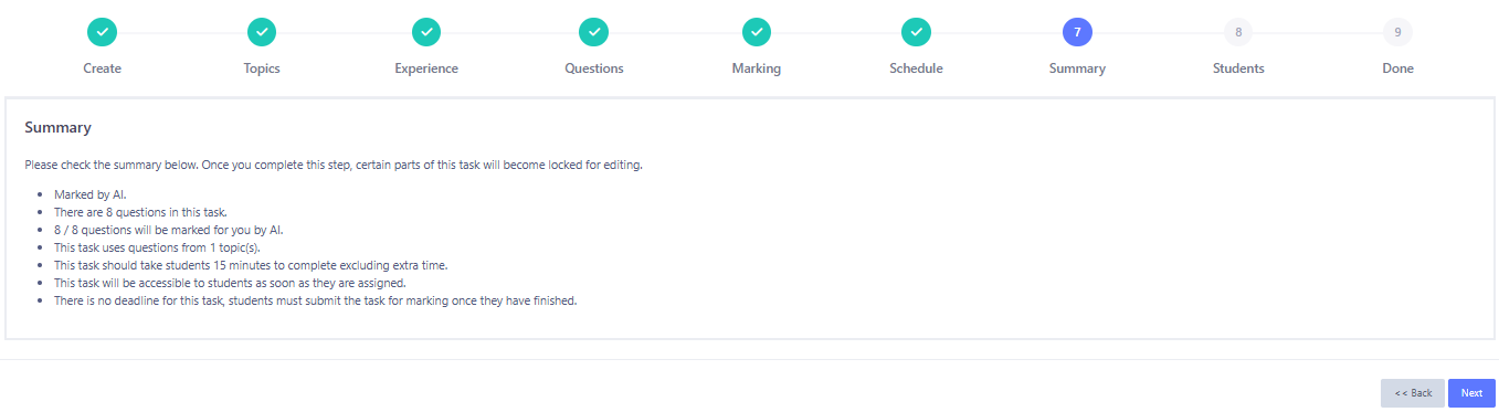 This gives you a summary of the task, you can go back and make any changes before continuing.