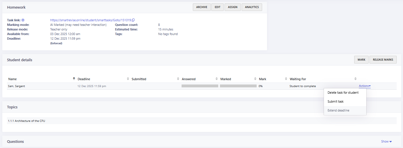 - If the task has already been submitted for marking, you will also need to return the task to the student using the "Return to student" option from the Actions dropdown once the deadline has been extended.