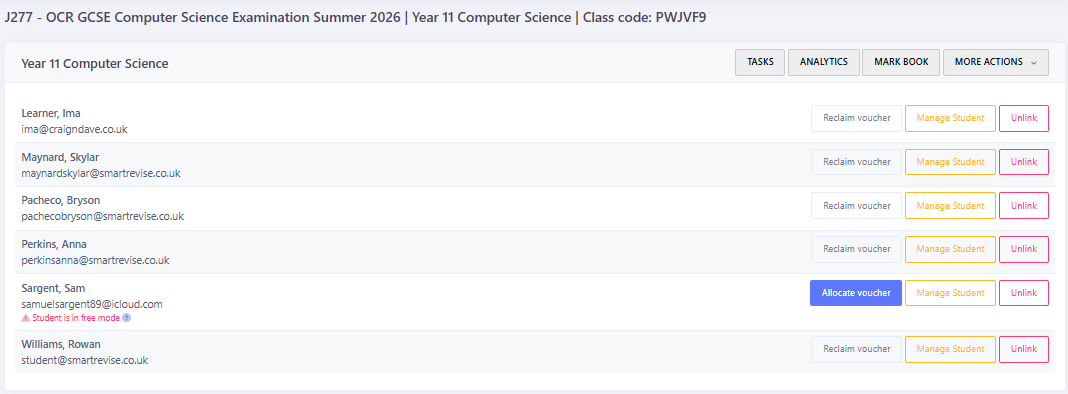 Here you will see all the vouchers you have purchased for your various courses along with how many are still to be claimed by students.