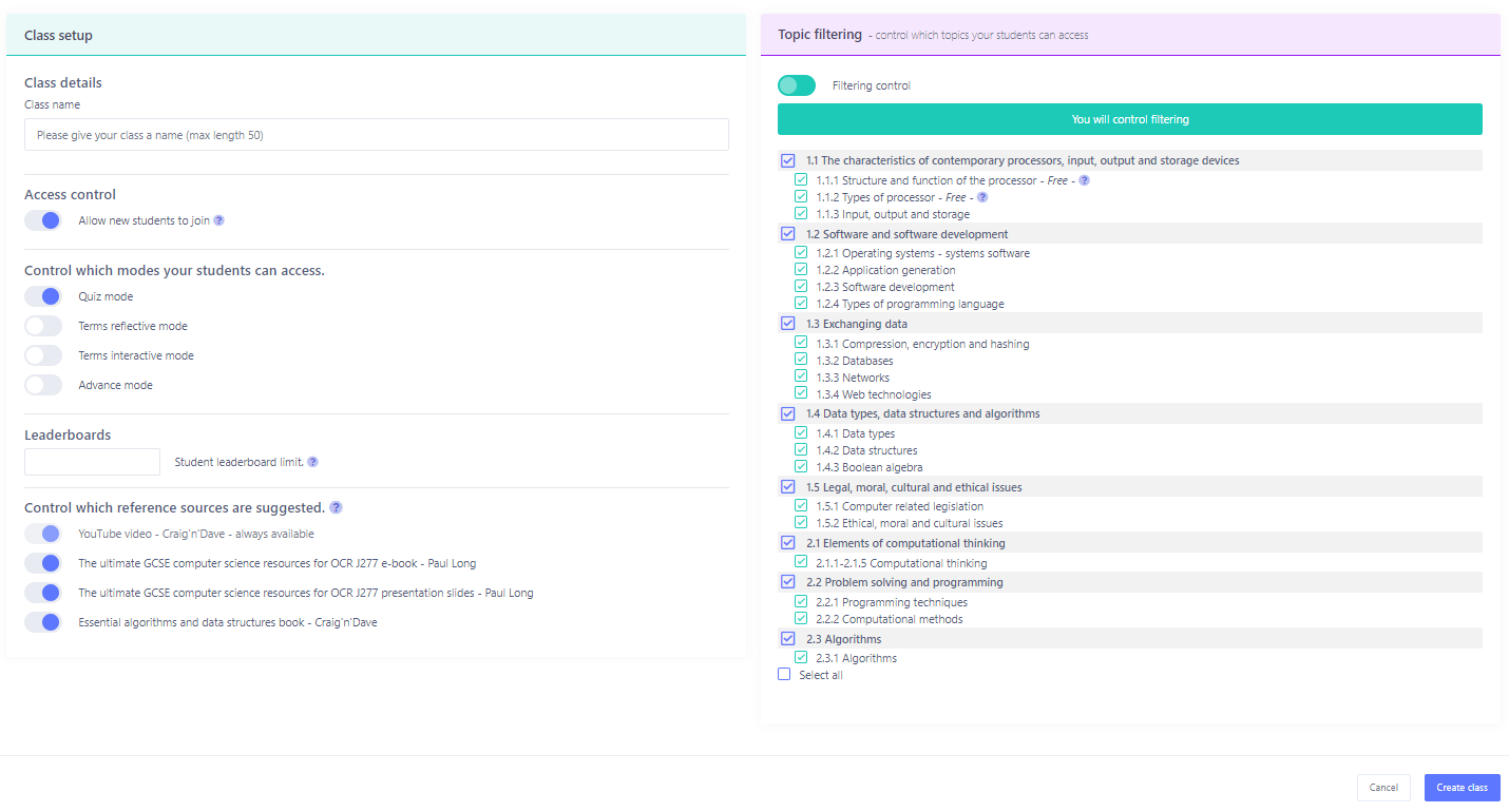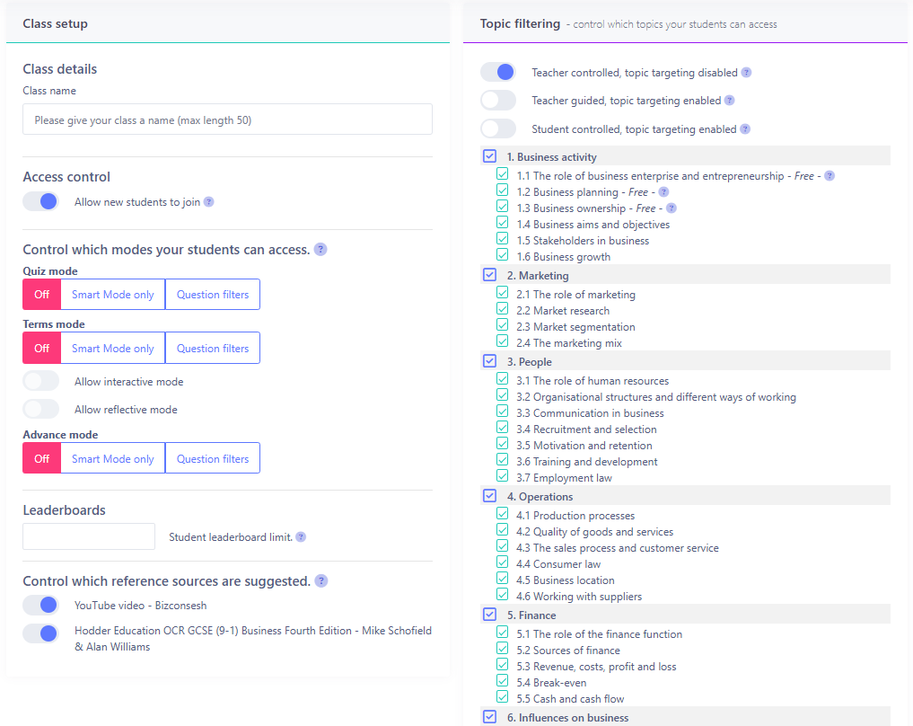 - Toggle topic filtering and select which sub topics can be accessed by students. (Turning this off will allow students to filter topics)
