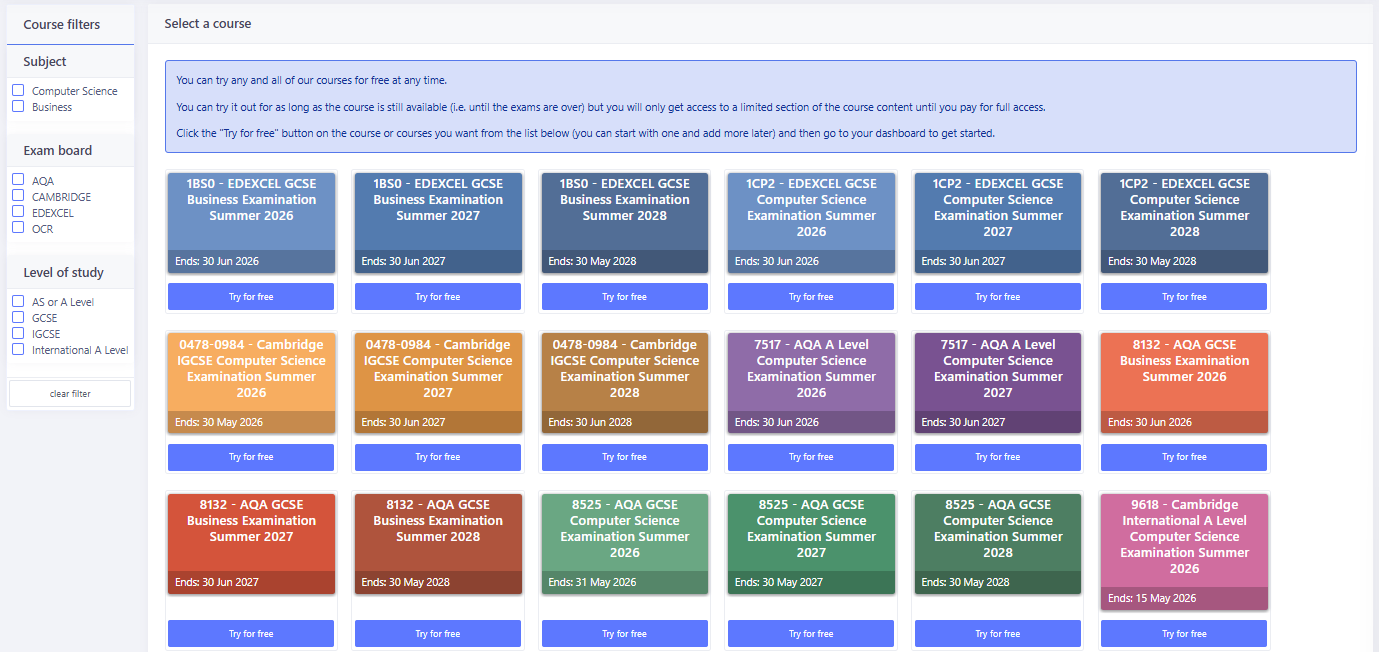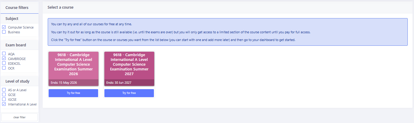 From the left-hand panel, you can filter the available courses by subject, exam board and level of study.