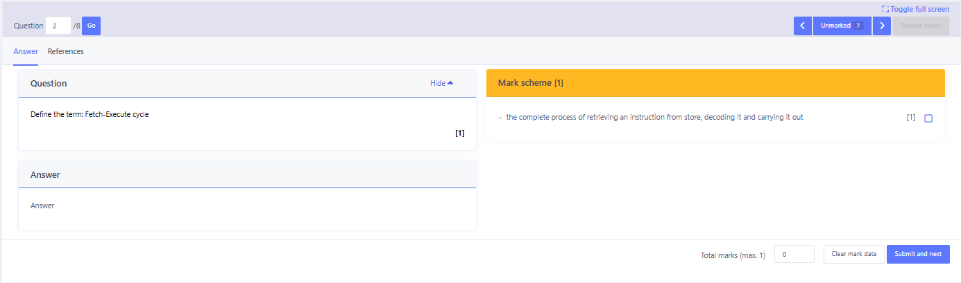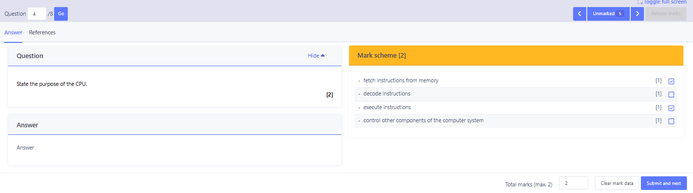 Look at the answer the student has submitted and compare it against the marks scheme. If the answer is correct, check the corresponding tick box in the mark scheme: