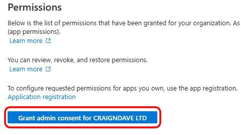 5. Select Grant Admin consent for CRAIGNDAVE LTD.