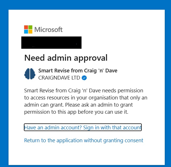 You may find that when your users attempt to access Smart Revise using Microsoft sign-in, an error message along the lines of "Smart Revise from Craig 'n' Dave needs permission to access resources in your organisation" is displayed.