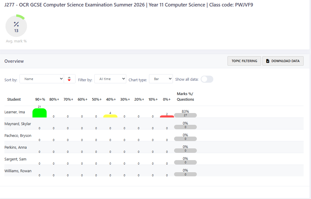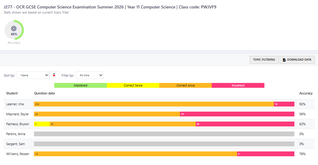 - A breakdown of questions Mastered, Correct Twice, Correct Once and Incorrect.