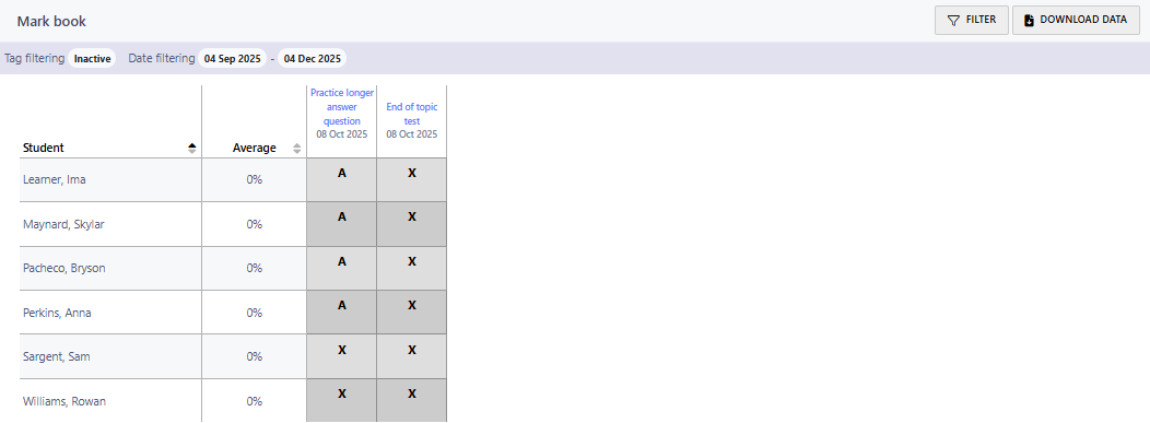 You are also able to export the mark book as a CSV file by clicking Download data. The CSV file is a downloaded copy of the mark book as you see it on the screen.