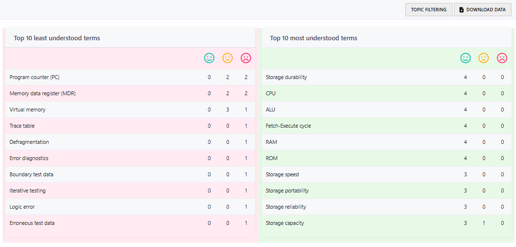 This will show you: A list of terms you can choose to view data for The question and definitions Each student and their confidence rating Each students last answer You can use topic filtering on this report
