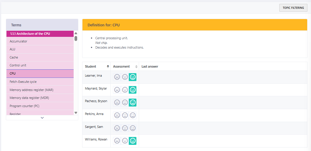 You will see a breakdown of the Top 10 least understood terms and top 10 most understood terms. This will also give you a breakdown of how confident a student is for the top 10 terms You can use topic filtering on this report.