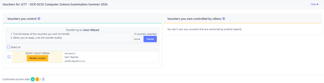 Once the process is completed, you will see the vouchers have moved across to the Vouchers you own controlled by others column.