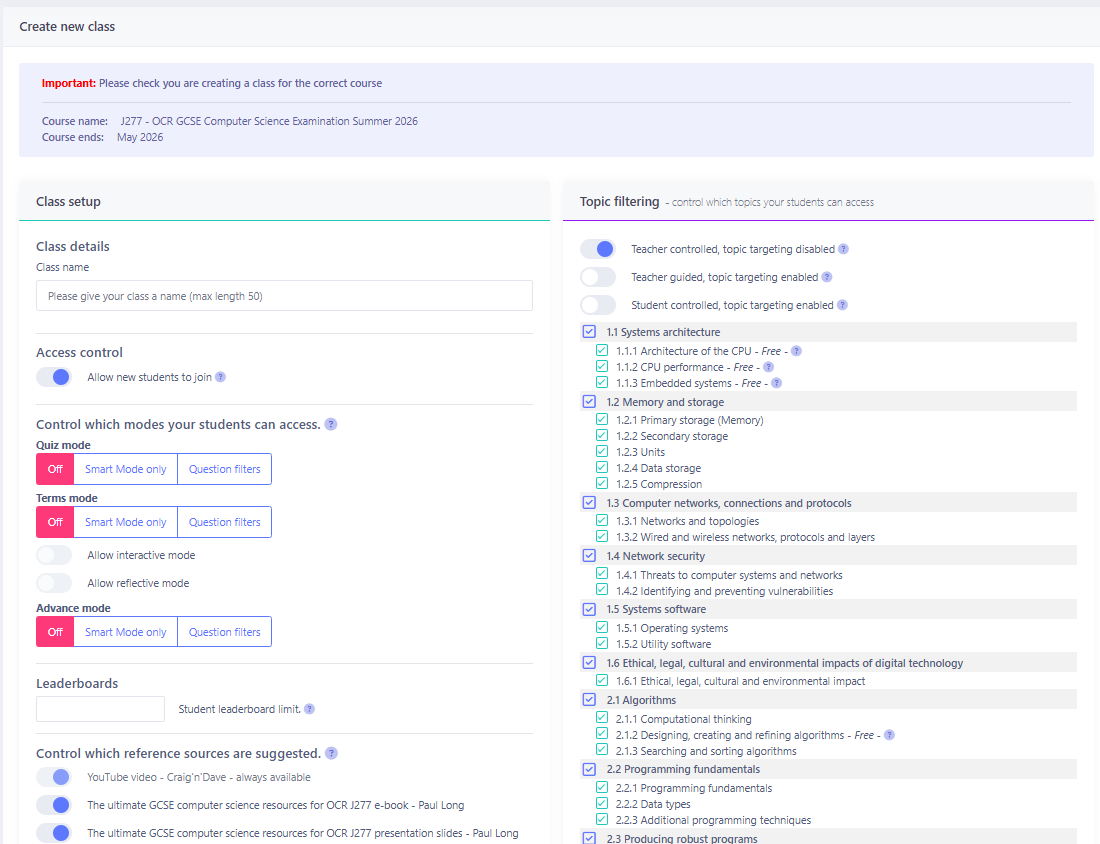Enter an appropriate name for your class and make sure to enable the modes you want your students to be able to access.