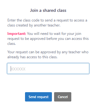 REQUESTS TO JOIN A SHARED CLASS AS A TEACHER MUST BE APPROVED BY A TEACHER WHO IS ALREADY A MEMBER OF THAT CLASS.